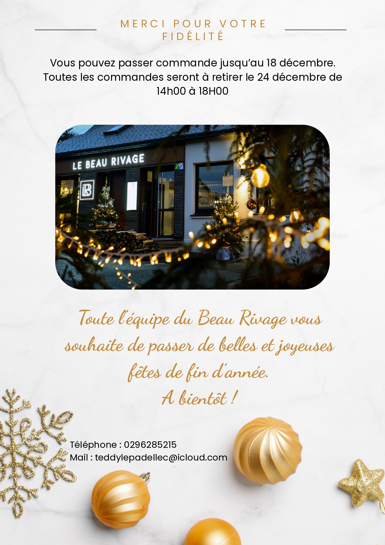 La bonne nouvelle ? Vous pouvez commander votre menu de Noël à emporter directement par téléphone. Pour simplifier vos préparatifs de fête, le restaurant Le Beau Rivage à Guerlédan vous propose un service de commande flexible, afin que vous puissiez récupérer votre repas le 24 décembre de 14h à 18h. L’équipe se charge de tout préparer avec soin pour garantir un repas de qualité, comme si vous étiez sur place.